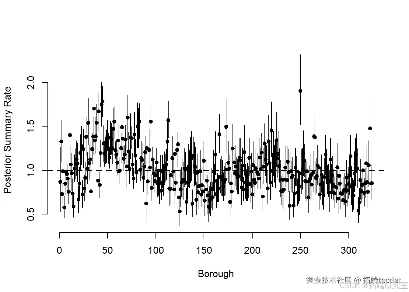 在检查链的收敛性后,可以绘制每个参数的后验均值和95%置信区间: