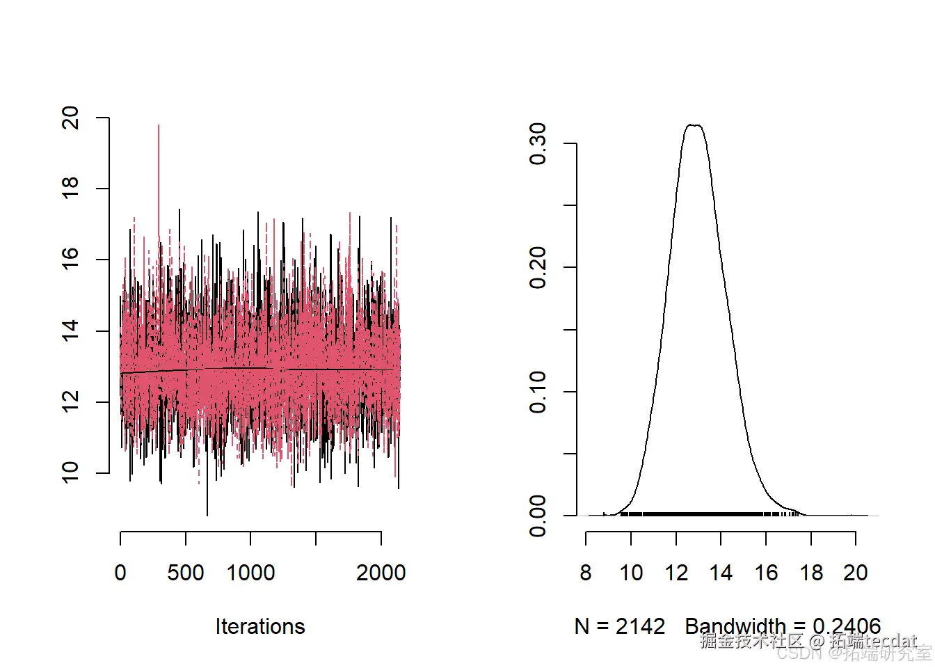 通过检查所有可用样本中的最小值来检验有效样本量,以确保该最小值是可接受的。同时,还提供了一些参数链的轨迹图。运行上述代码后,会得到有效样本量和WAIC的相关信息。接下来,对后验分布的样本进行处理,并绘制一些参数的轨迹图: