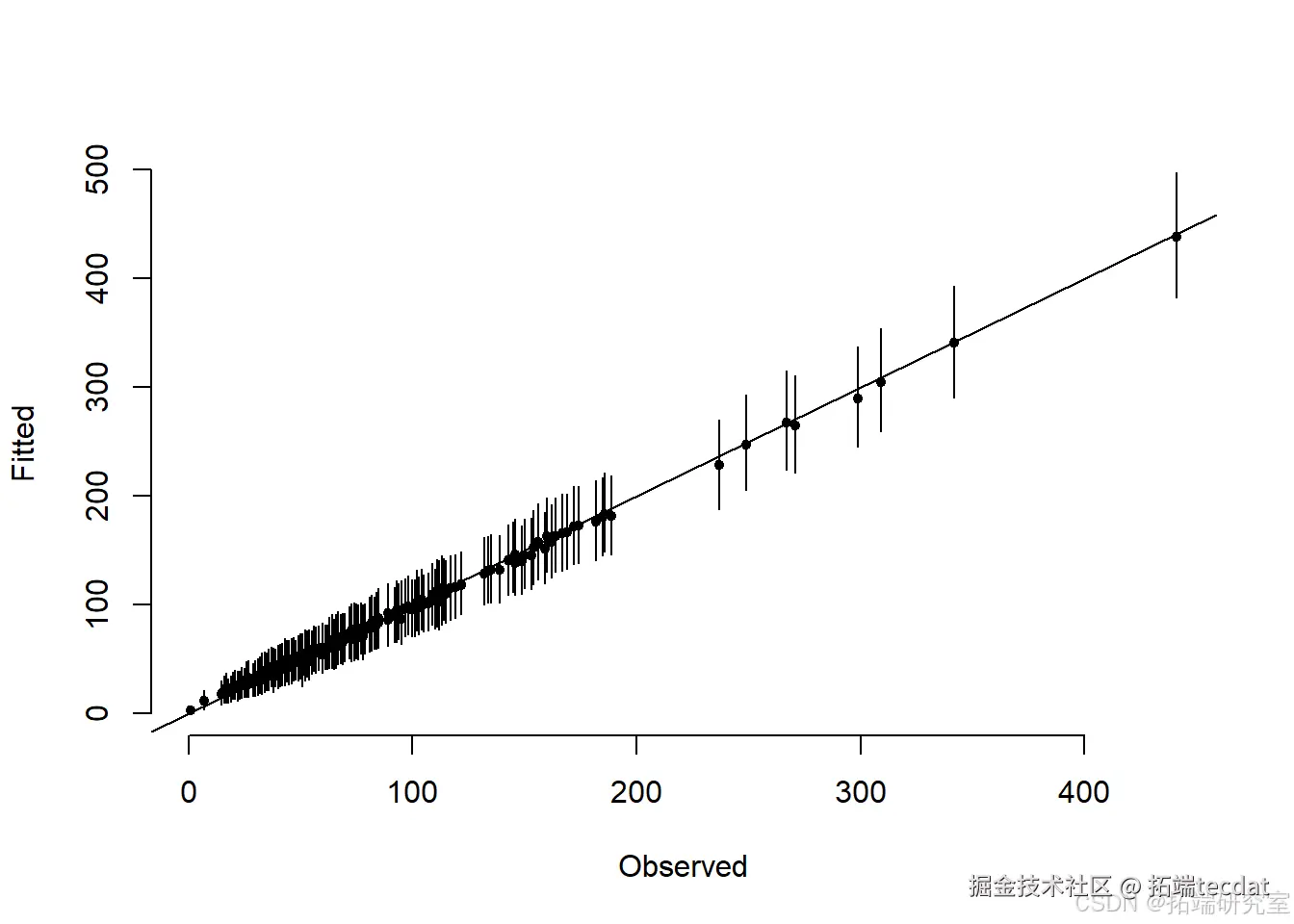 segments(y_obs[i], post_fitted$`95%CI_low`[i], y_obs[i], post_fitted$`95%CI_upp`[i])
