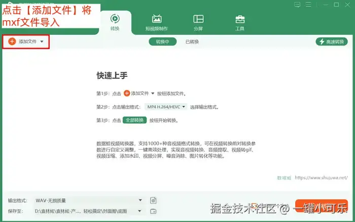 步骤1:打开数据 蛙视频转换器,进入格式转换界面,点击【添加文件】将mxf文件导入。