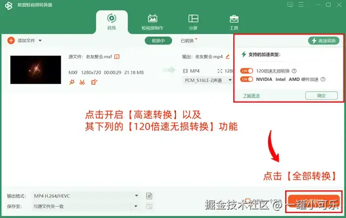步骤3:点击开启【高速转换】以及其下列的【120倍速无损转换】功能,最后点击【全部转换】。