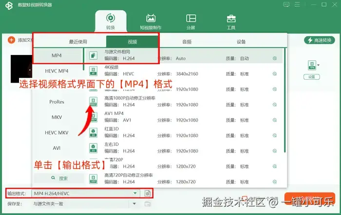 步骤2:单击【输出格式】,打开音视频格式选择界面,选择视频格式界面下的【MP4】格式。