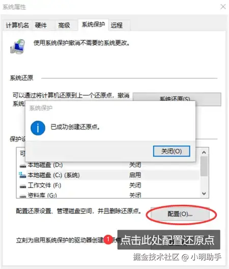 第2步:在该页面可以查看该功能的开关状态,如已开启,则选择点击下方【配置】设置还原点,后面按照指示继续操作后,最后点击【确定】。