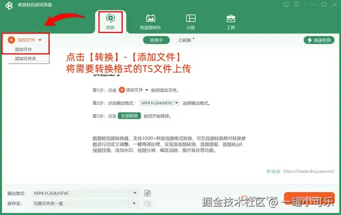 步骤1:运行数据 蛙视频转换器,点击【转换】-【添加文件】将需要转换格式的TS文件上传。