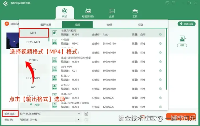 步骤2:点击转换格式界面下的【输出格式】选项,选择视频格式【MP4】格式。