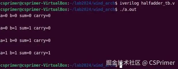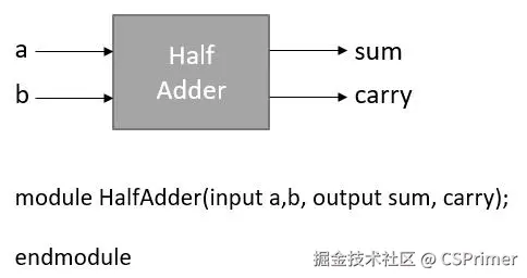 下面就是半加器的符号和verilog实现,输入是a b输出out是sum跟carry,大家自己去实现一下,就是把前面实现的异或门跟与门组合起来实现半加器,