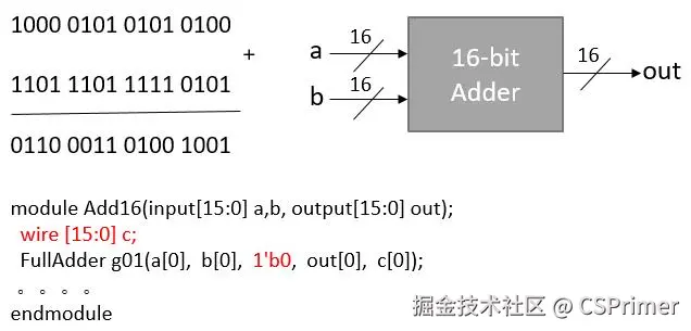 然后我们把16个全加器组合起来,构成一个16位的加法器,下面是它的符号和verilog实现,这里的input[15:0]就代表a b是16位的,那么获取a b的每1位就是a[0] [a1] [a2] ...,这里的输出out也是16位的,我们通过一个wire[15:0] c来表示中间结果,这个c也是16位的,那么第一个全加器它的进位输入就是0,表示方式就是1b代表一个1位二进制值是0,它的进位输出是c[0],