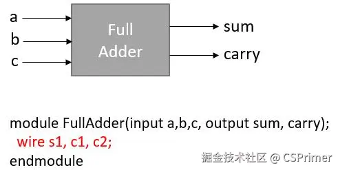 下面是全加器的符号和verilog实现,输入是a b c,输出是sum跟carry,这里我们通过一个wire就是线的意思来表示它的中间结果,比如a b相加的中间结果是S1,我们再把S1跟这个c相加输出是sum,然后a b相加的进位是C1,然后我们再把C1输入到一个或门里面,大家根据上面的电路图自己去实现一下。