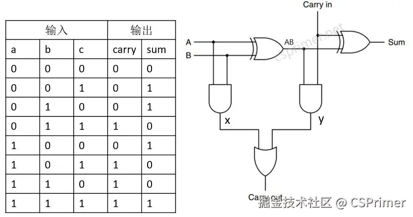 然后a+b+c的进位,我们可以结合十进制来看,如下8+7是等于5进位是1,然后8+5是等于3的进位是1,再把两个进位1相加等于2,所以a+b+c的进位,就是a+b的进位x,跟a b相加的输出AB再加上c它的进位y, 两个进位x和y再相加,因为通过这个真值表我们可以推出来,这两个进位x y不可能同时为1,所以这里我们就没有再用一个加法器,而直接使用一个或门就可以了。