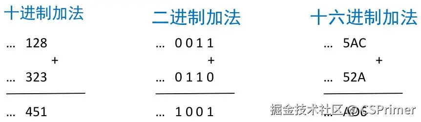 再看下面的加法,十进制的加法我们比较熟悉了它是逢10进1,而二进制是逢2进1,1+0等于1,1+1=2结果是0进1,然后1+1=0再进1结果是1,十六进制它是逢16进1,c是12,A是10那么就是22,22减16是6结果进1,然后a加2再加1就是13,D,5加5是10 对应的是a。