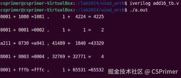 然后我们就把第一个全加器它的进位输出c[0]作为第二个全加器它的进位输入,依此类推下去把这16个全加器组合起来,最后一个全加器它的进位输出就输出到c[15],我们就不用管了,大家自己实现一下,下面是效果。