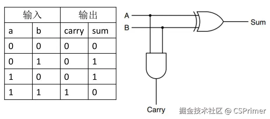 首先我们看1位二进制的加法的实现,下图中a加b结果是sum进位是carry,那么我们通过下面的真值表可以看出来,0+0是等于0的,1+1是等于0的,其他情况相加的结果是1,所以这正好符合异或门的特性,我们把a b输入到一个异或门,它的输出就是a加b的结果sum,然后再看进位,1+1的进位是1,其他情况相加进位都是0,所以这正好符合与门的特性,我们把a b输入到一个与门,那么它的输出就是a+b的进位carry。参考:基本门电路的实现