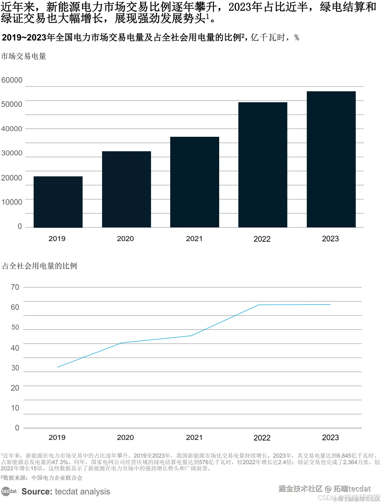 2019 至 2023 年,我国新能源市场化交易电量持续增长,2023 年更是达到 6,845 亿千瓦时,占新能源发电总量的 47.3%。同年,国家电网公司绿电结算电量跃升至 576 亿千瓦时,绿证交易也激增 15 倍,达到 2,364 万张。