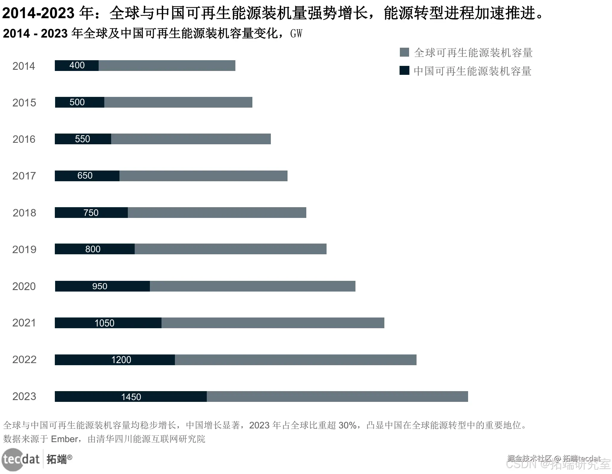 随着全球对气候变化问题的关注度不断提高,能源行业的转型进程加快,可再生能源在全球能源结构中的地位愈发重要。在过去十年里,可再生能源装机容量和发电量呈现出显著的增长态势。2023年,全球可再生能源装机容量达到3,896.71吉瓦,相较于2014年增长超一倍;发电量达到8,971.25太瓦时,较2014年增长69.56%,其中中国在全球可再生能源领域的贡献突出,2023年其装机容量和发电量占全球比例均超过30% 。同时,可再生能源发电技术的进步带动了成本的降低,使其逐渐具备与传统能源竞争的实力。