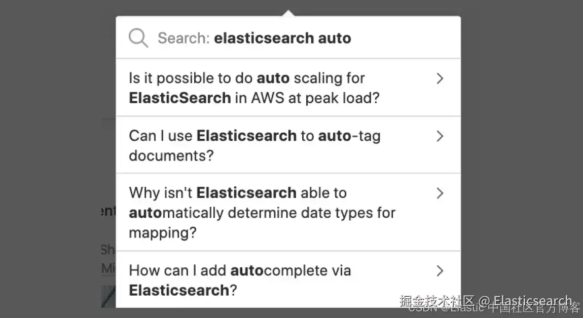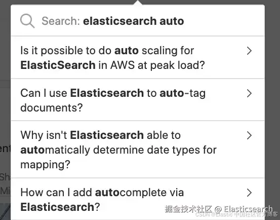 注意搜索结果中,有与 Elasticsearch 的自动扩展、自动标记和自动完成功能相关的问题。用户可以进一步输入一些字符来细化搜索结果。
