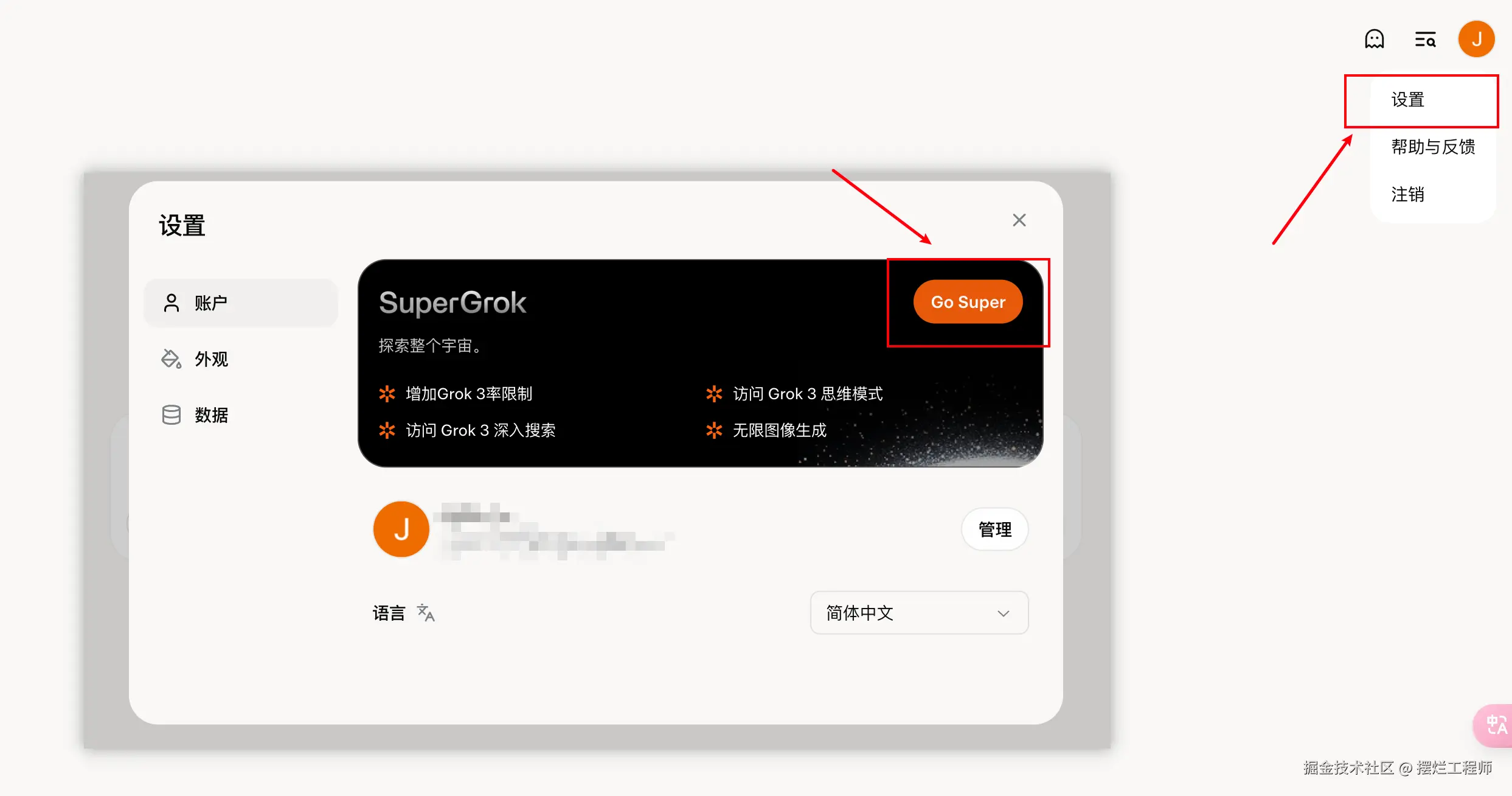 (1)打开Grok网页版 或者 移动版。找到 “设置” 点击 “Go Super” 就可以订阅升级 Super Grok。