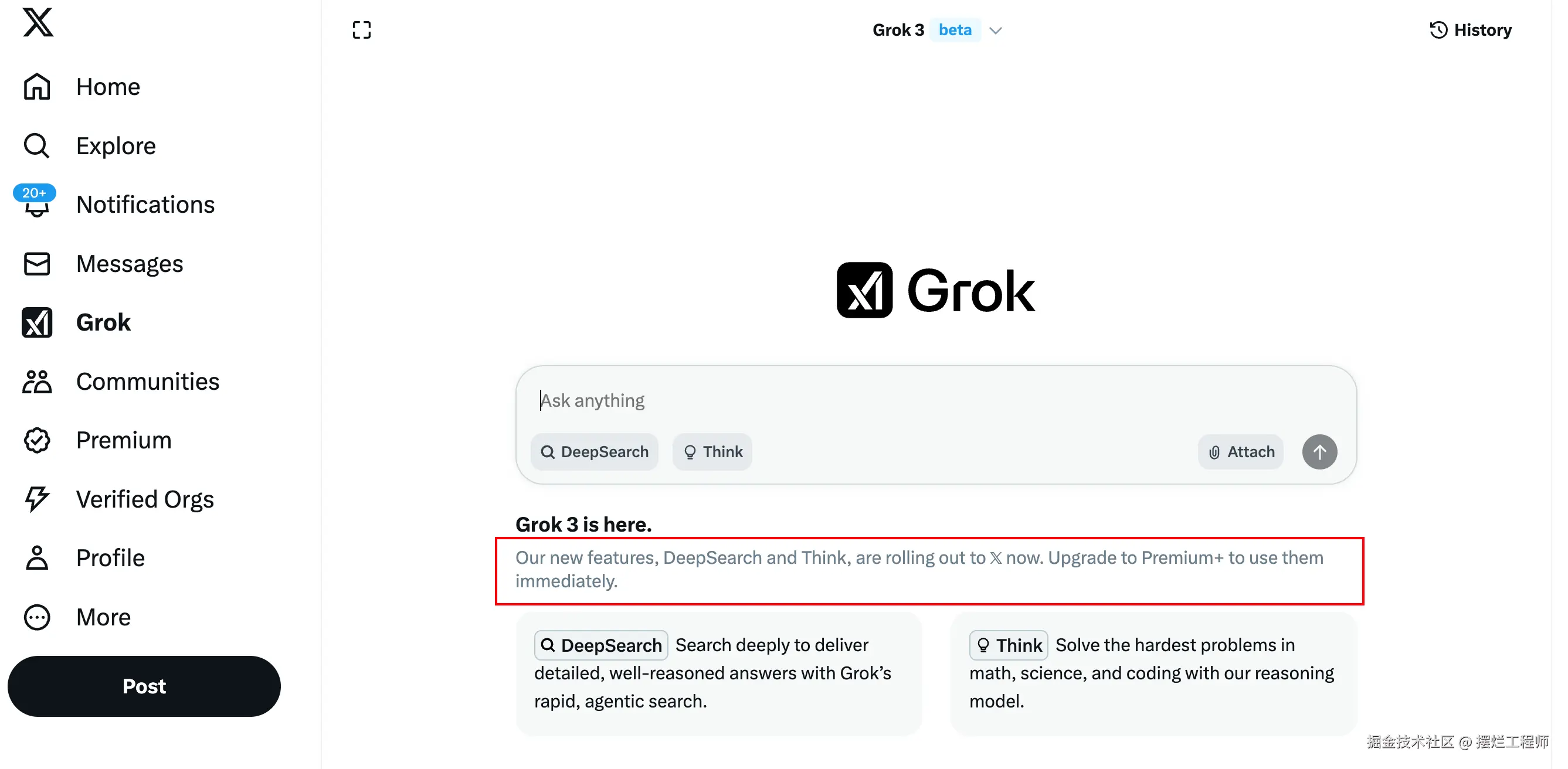 但是,免费用户也是可以使用Grok3的两个功能:Think 和 DeepSearch。