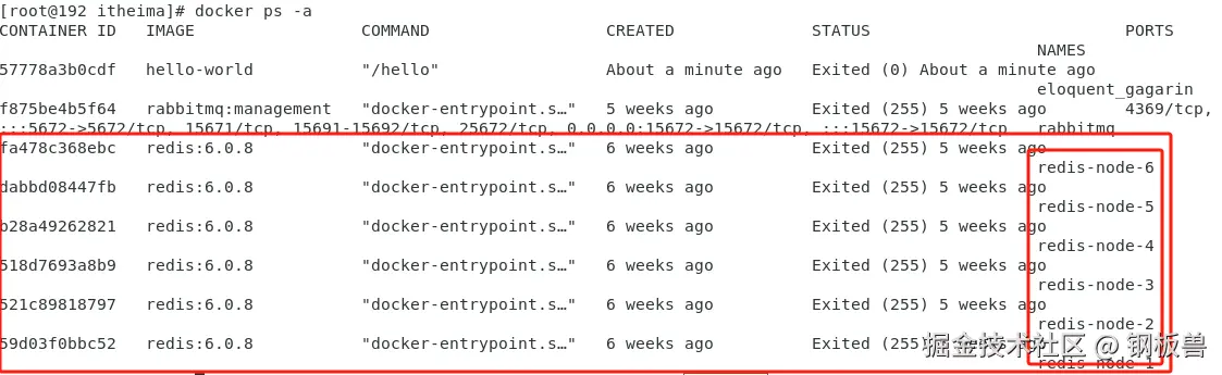 docker ps -a打印内容出现六个Redis容器的名字,说明创建成功。