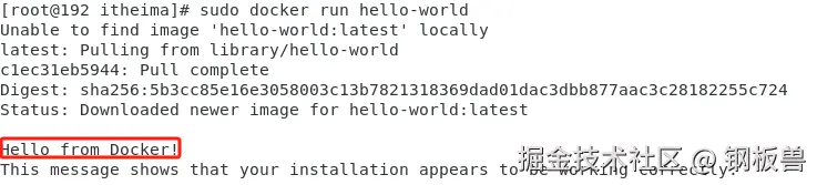 sudo docker run hello-world打印内容如下图说明安装成功。