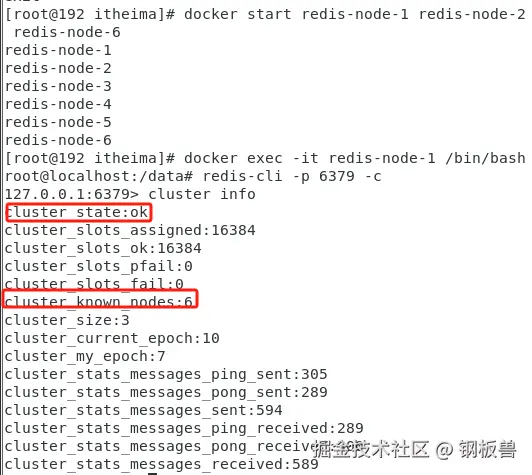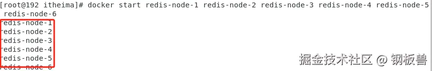 docker start redis-node-1 redis-node-2 redis-node-3 redis-node-4 redis-node-5 redis-node-6进入其中一个Redis容器内部: