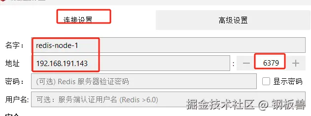 在RESP中配置连接,填写名字(随意)、地址(与虚拟机ip一致)、端口(与Redis节点对应端口一致)、密码(如果没有密码则不用填写),如下图: