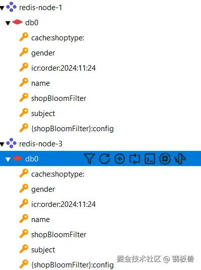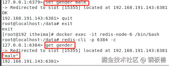 docker exec -it redis-node-1 /bin/bash redis-cli -p 6379 -c set gender male在redis-node-6中读取key:gender