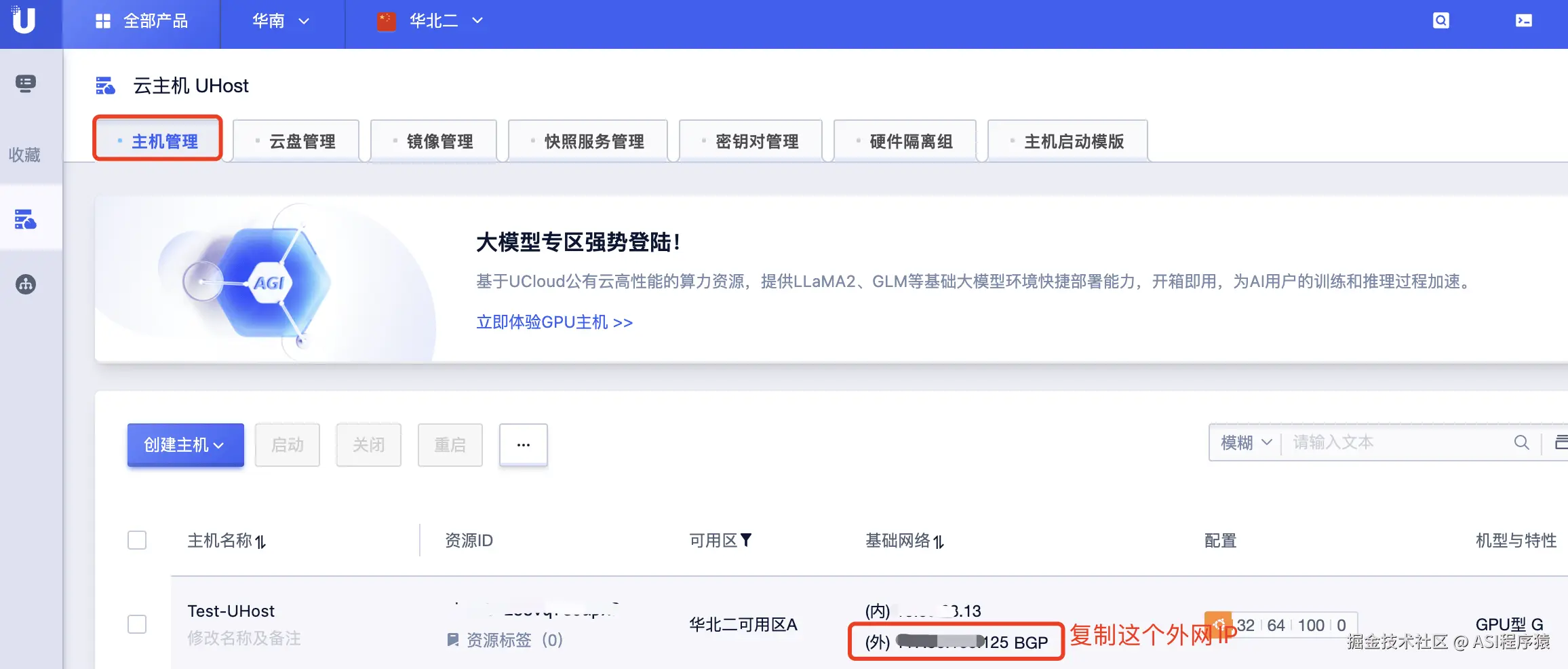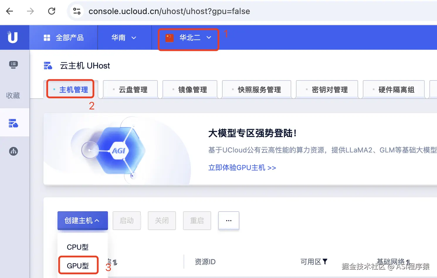 选择地域为 “华北二”—>“主机管理”—>创建主机上选择 “GPU型”