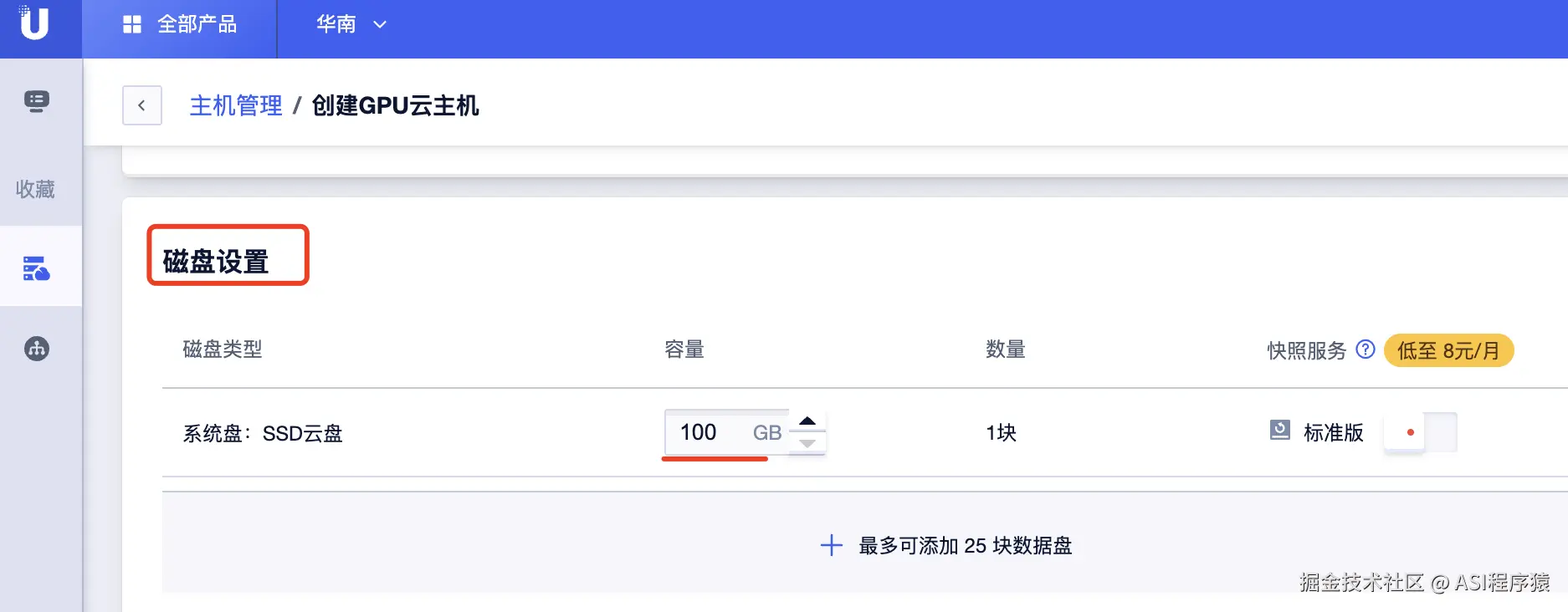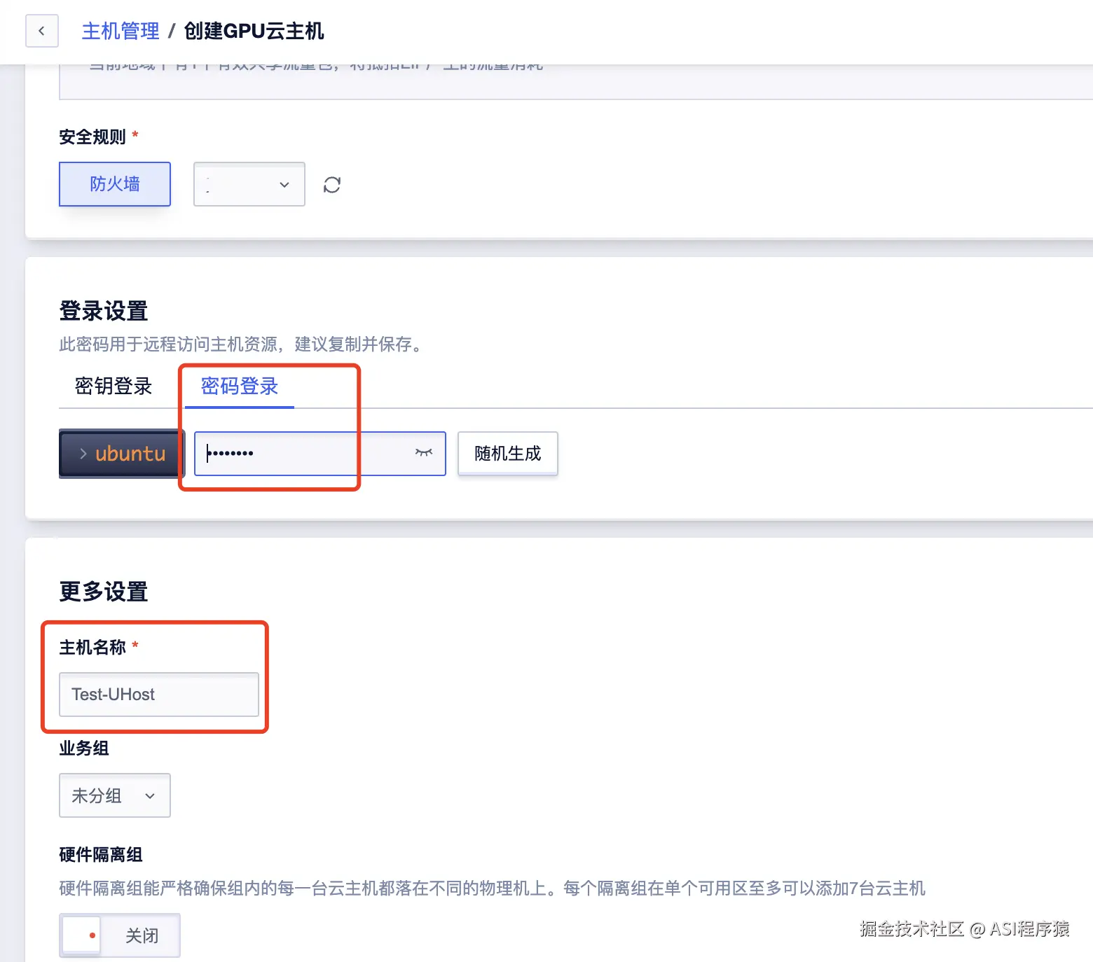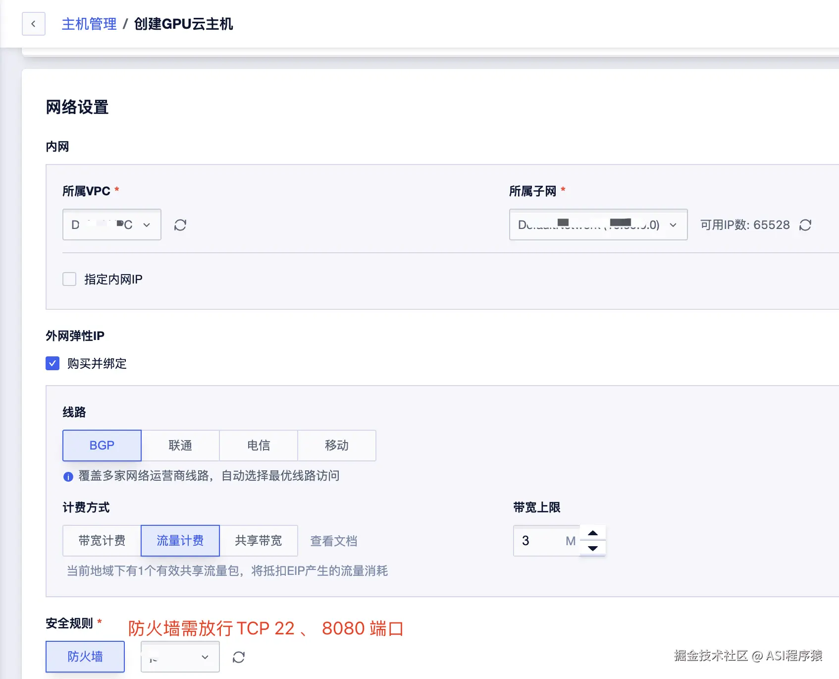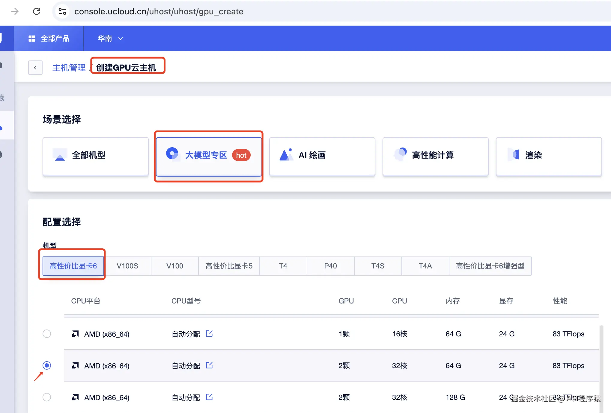 进入创建GPU云主机, 这里大模型专区,机型选择“高性价比显卡6”, 以及选下面具体云主机配置