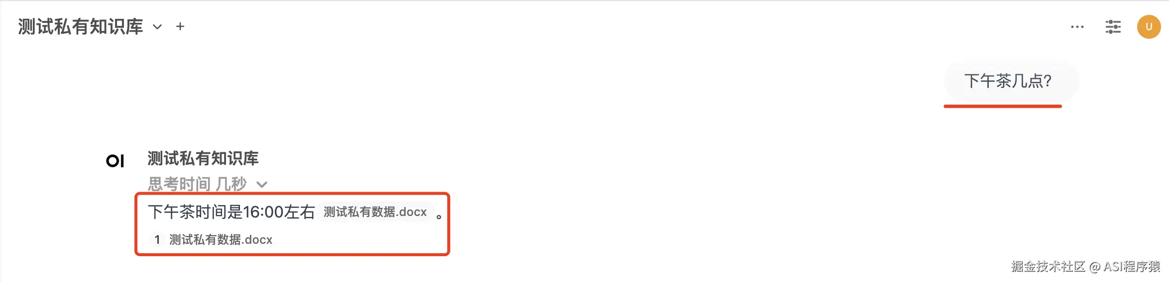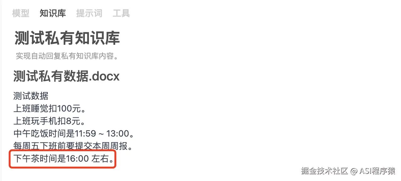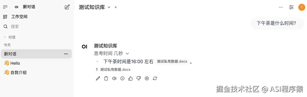 提问知识库文档内容“下午茶是什么时间?”,回答“下午茶时间是16:00 左右”。