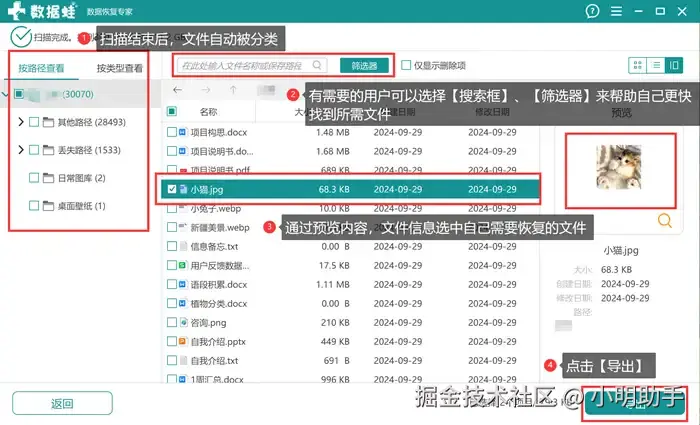 步骤2:在文件扫描结束后,选择自己需要恢复的文件,点击【导出】;