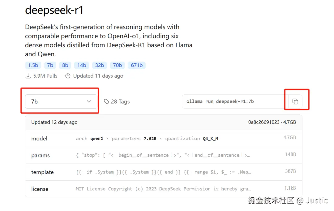 - 在搜索栏输入“DeepSeek”进行搜索,找到DeepSeek-r1,咱们这次要的是7b模型,直接点进去,然后点击右边的复制按钮,把下载命令复制下来。