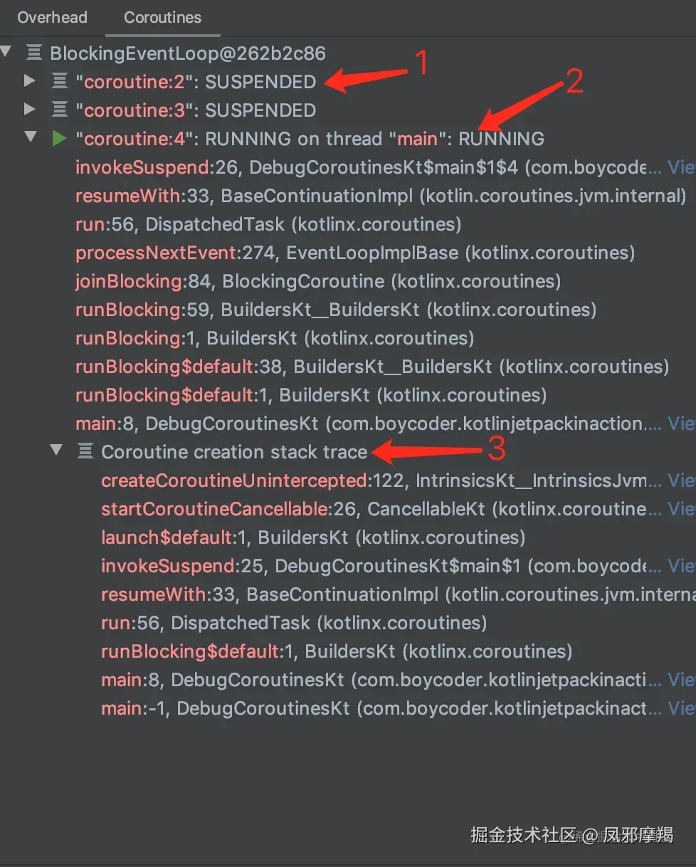 在上面的调试框中,我们能看到我们的代码当前有三个协程,其中1的位置,代表:corouine2, coroutine3 的状态是 Suspend;2的位置,代表corouine4 的状态是 Running;3的位置,是该协程的创建栈。