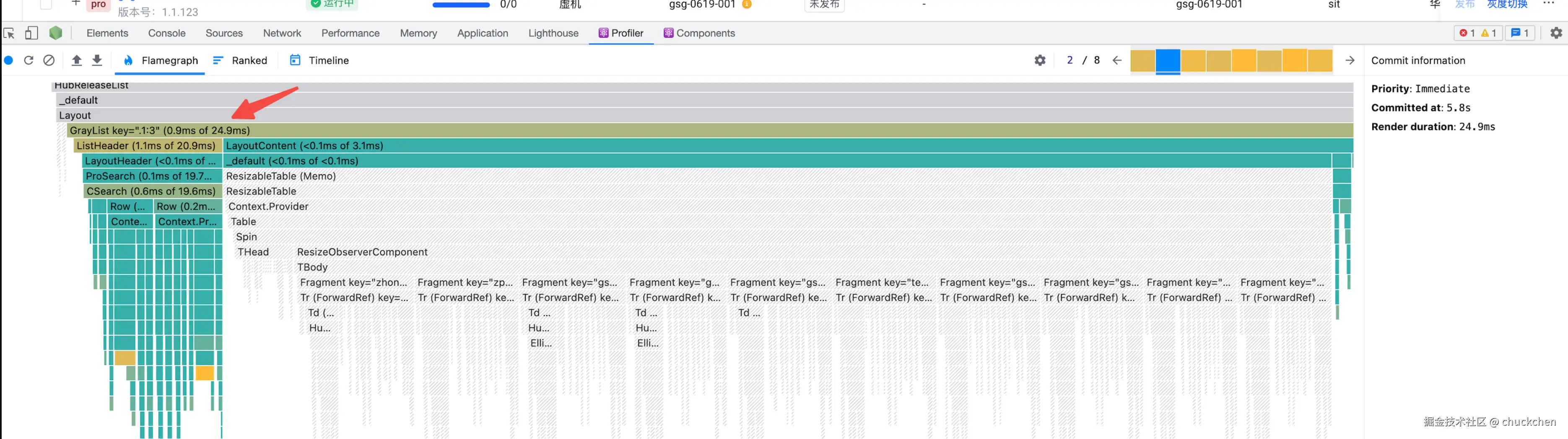 结果: 火焰图显示录制期间发生了34次rerender(重新渲染/更新), 且每次rerender基本会把整个灰度视图重新渲染一次,耗时长,平均每次rerender耗时120ms+