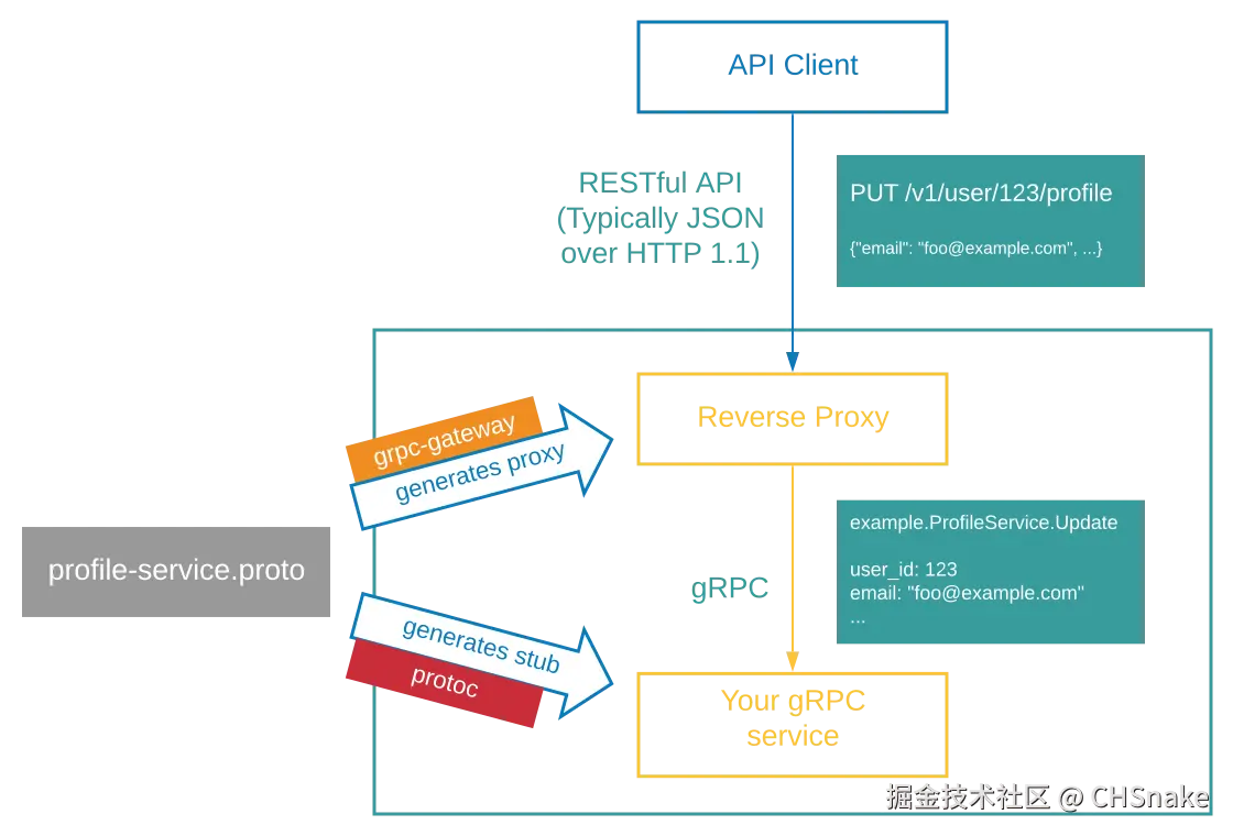 gRPC-gateway就是通过代码生成的方式把proto描述的服务翻译成HTTP服务的接口层和gRPC的接口层。