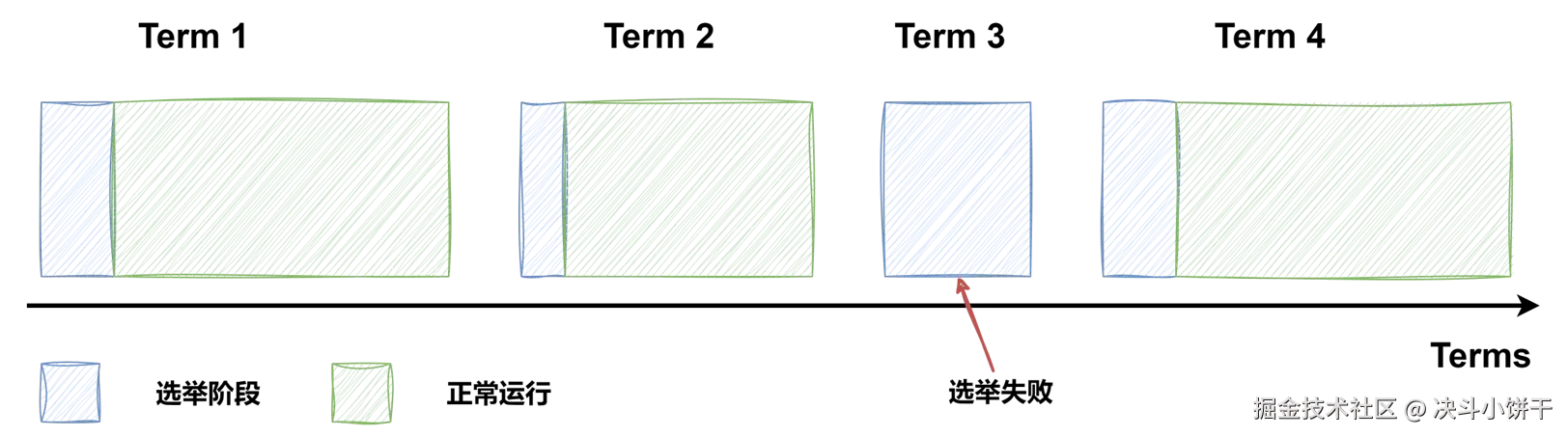 如图所示,raft 算法将时间划分为任意长度的任期(term),任期用连续的数字表示,看作当前 term 号。每一个任期的开始都是一次选举,在选举开始时,一个或多个 Candidate 会尝试成为 Leader。如果一个 Candidate 赢得了选举,它就会在该任期内担任 Leader。如果没有选出 Leader,将会开启另一个任期,并立刻开始下一次选举。raft 算法保证在给定的一个任期最少要有一个 Leader。
