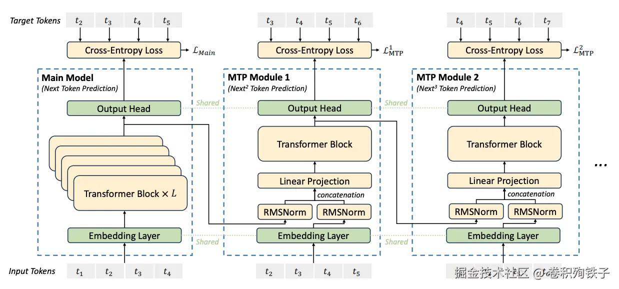 DeepSeek-V3 引入了一种新颖的 MTP 目标,允许模型同时预测多个 token。这一技术使训练信号更加密集,并能够更好地对 token 表示进行预规划,从而在复杂基准测试中提升性能。