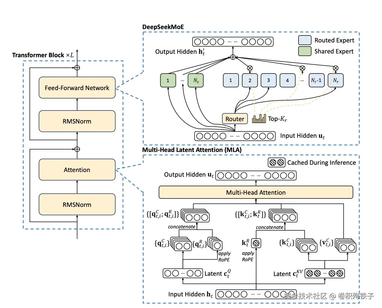 DeepSeek 的专家混合机制采用了更细粒度的专家,并引入了创新的负载均衡技术。与传统的 MoE 架构不同,它通过动态偏置调整消除了对辅助损失的需求,确保在不损失性能的情况下实现专家负载均衡。