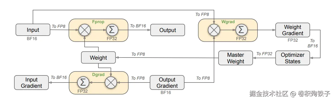 通过采用 FP8 精度进行关键计算,它降低了内存和计算成本。精细的量化和增加的累加精度确保了数值稳定性和训练的可靠性。