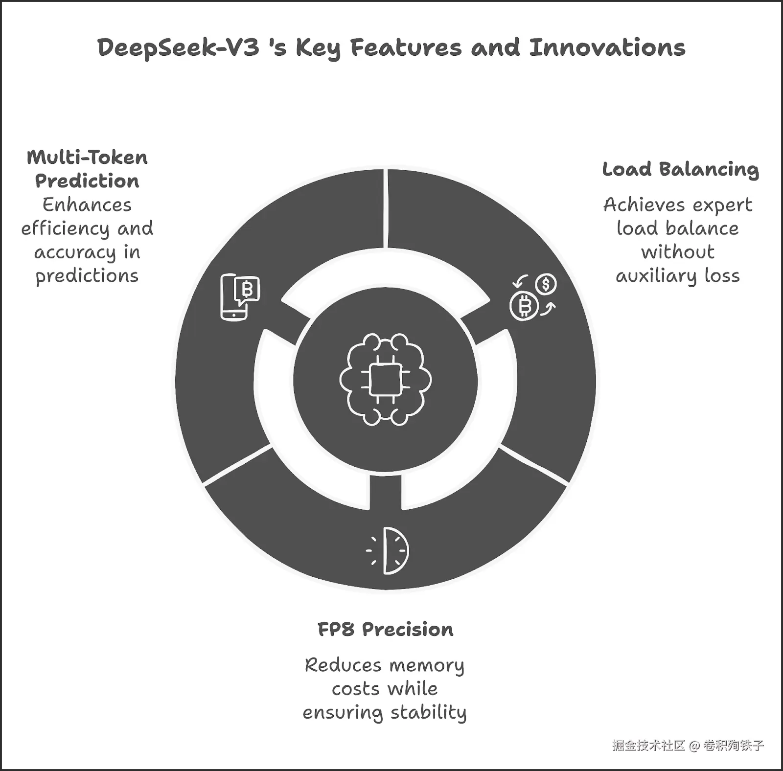 在核心部分,DeepSeek-V3 基于 Transformer 框架,但融入了多个先进组件以实现突破性的性能。架构的关键要素包括: