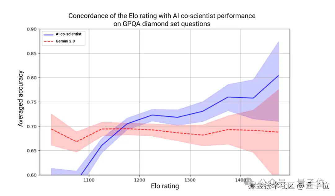 具体而言,Elo 评级是一个动态的评估指标,通常用于衡量比赛者的相对技能水平。研究人员对比了 AI co-scientist(蓝色线)和 Gemini 2.0(红色线)在 GPQA(General Problem-solving Question Answering)基准测试上的平均准确率。