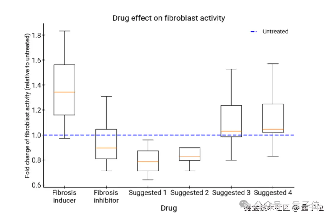 对比它所提出的一系列潜在治疗方案,和传统的纤维化诱导剂(作为阴性对照)以及抑制剂(作为阳性对照)来看,所有由 AI co-scientist 建议的药物都显示出有希望的活性(p 值小于 0.01)。