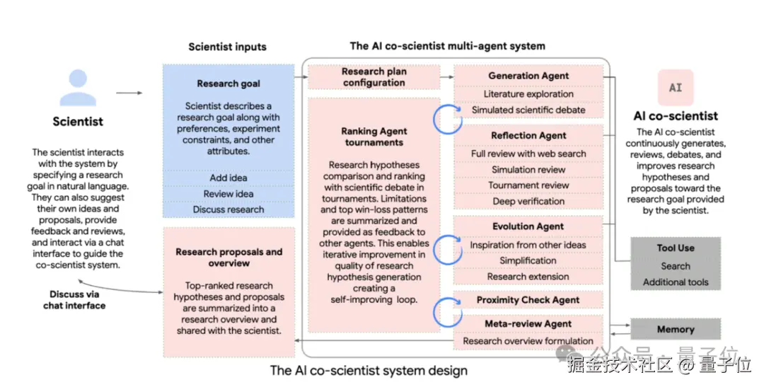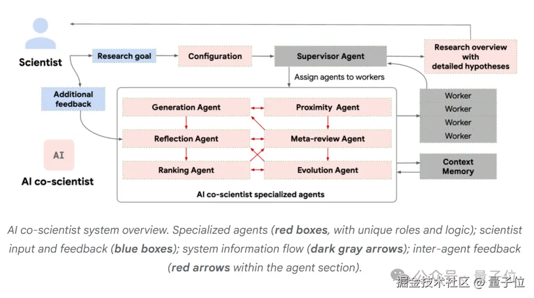 其目标非常清晰,当科学家文字给出研究主题后,它会借助多个 AI 智能体帮助生成新的研究假设、详细的研究概述和实验方案。