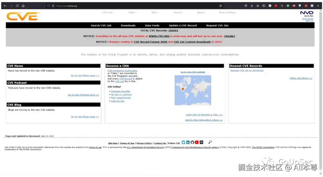 识别、定义与发布公开披露的漏洞CVE的官方站点。