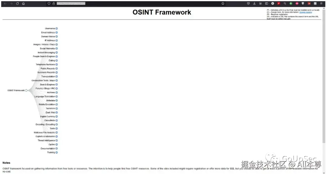开源威胁情报(OSINT)框架网站,虽然有些链接失效但依然是一个很有价值的站点。