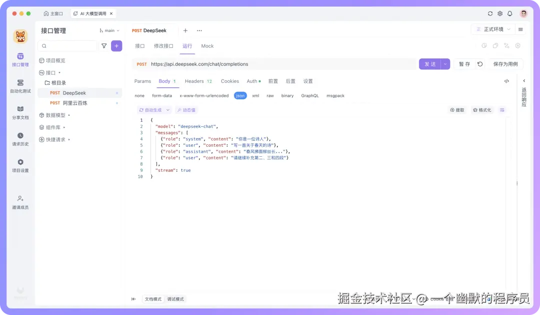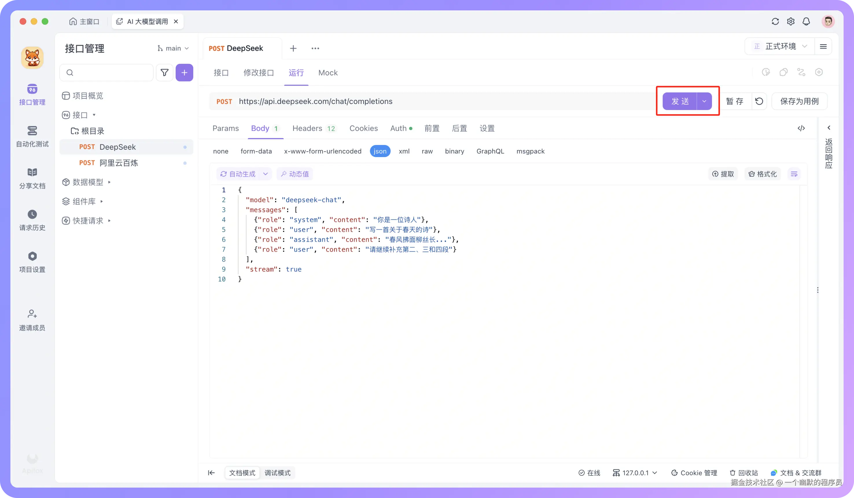 将 Apifox 更新到最新版本后,以将上面的 cURL 导入到 Apifox,注意stream字段的值需要为true,其中可在messages数组中按顺序添加对话记录,或者输入请求的问题。