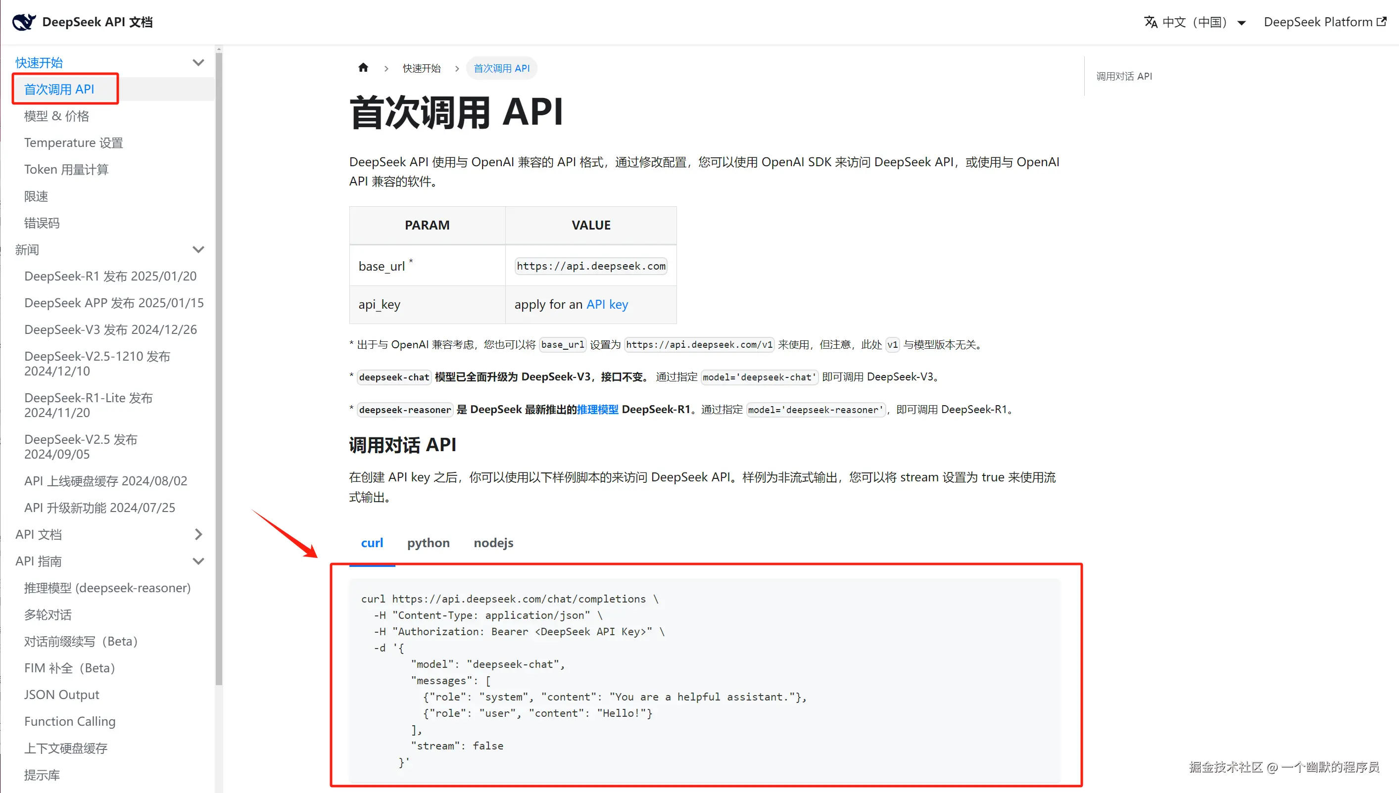 在 Deepseek 申请 API Key 后,保存下来先,并在开发者文档复制 cURL。