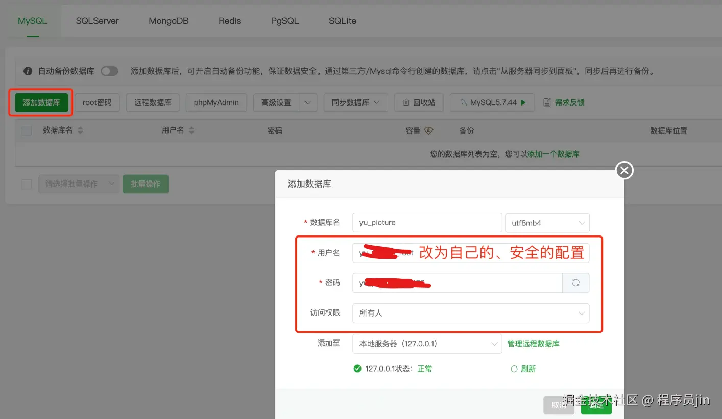 先为后端项目添加一个数据库。数据库名称和我们项目需要的数据库名称保持一致(,注意用户名、密码和访问权限: