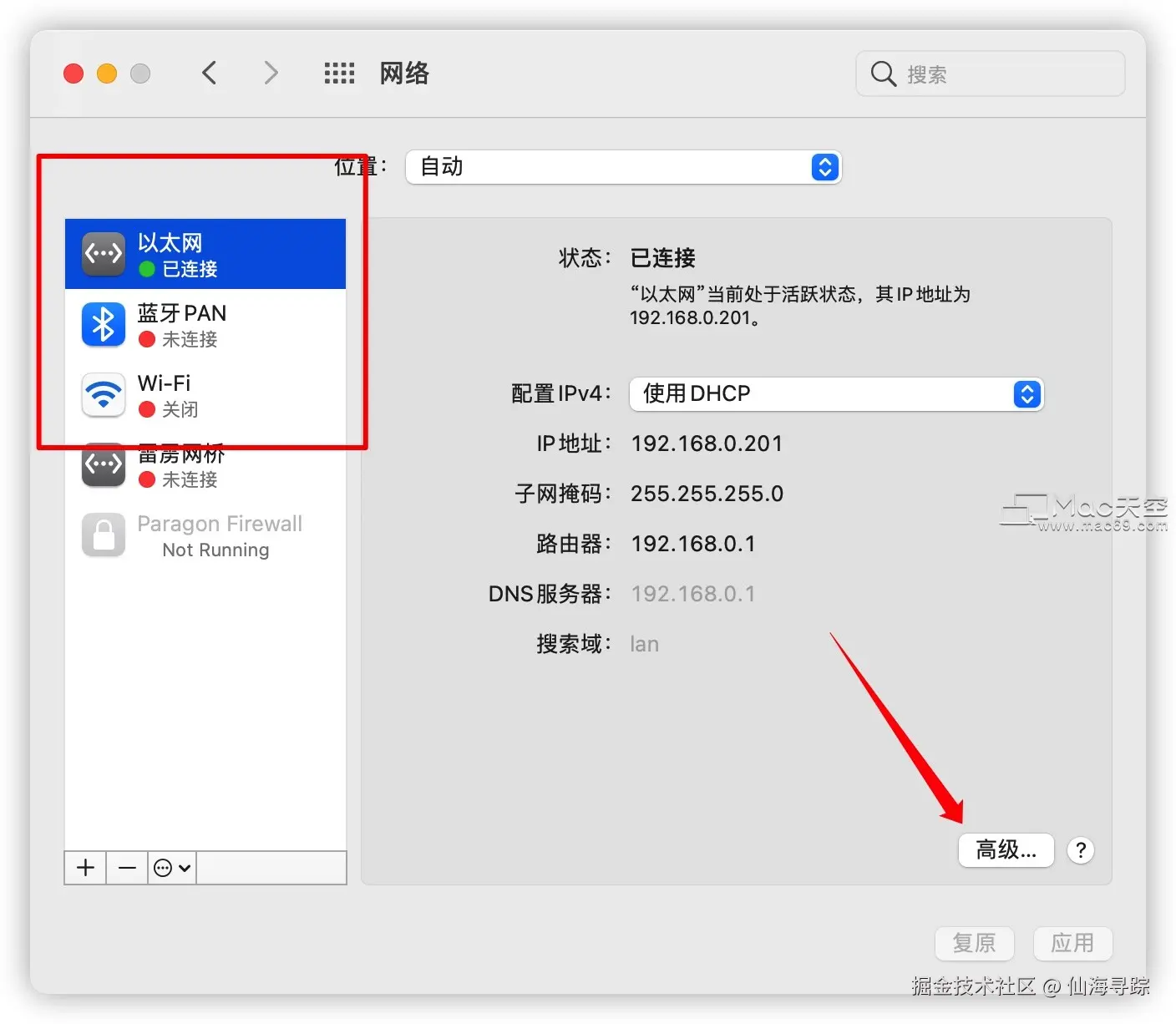 三、接下来,我们从列表中选择相应的网络连接服务,如果你用的以太网就以太网,用的wifi就点击wifi,然后单击【高级】选项,操作如下示意图。