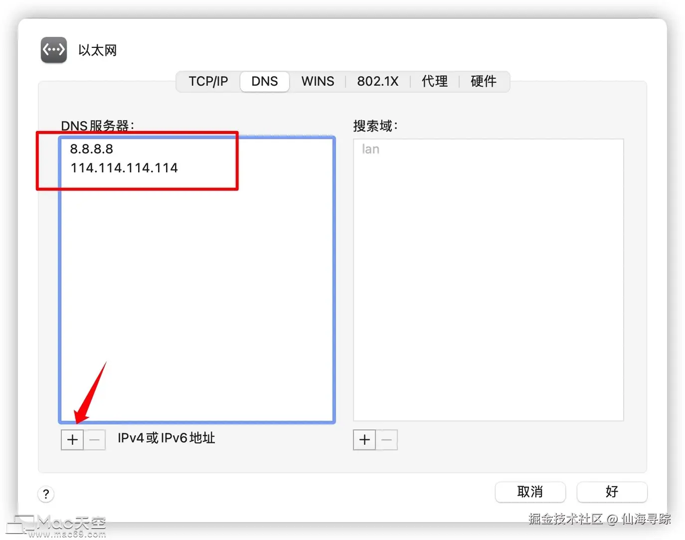 四、最后我们再点击DNS的选项卡,然后点击左下角【+】图标,然后就可以手动添加自己需要的DNS地址了,比如可以将114DNS地址【114.114.114.114】和谷歌DNS地址【8.8.8.8】添加进去,完成后点击【好】,就可以完成Mac DNS地址修改设置了。