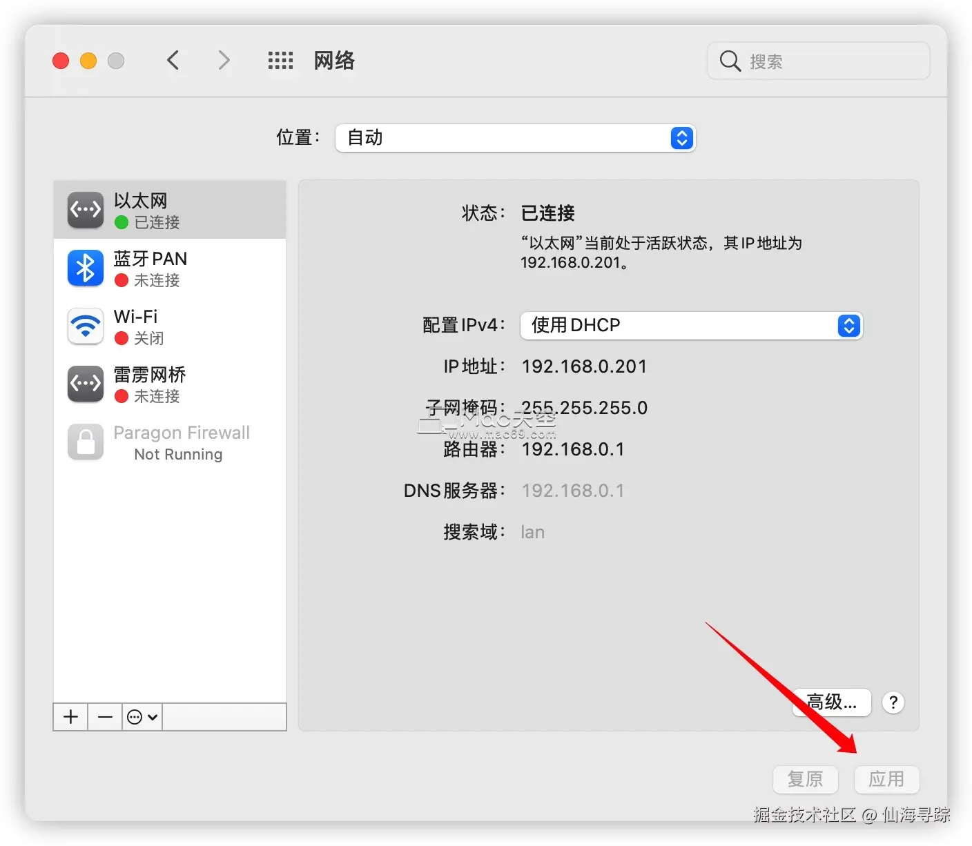 Mac设置完DNS后,返回到上一级,再单击【应用】,就可以保存以上设置,MAC设置DNS就全部完成了。